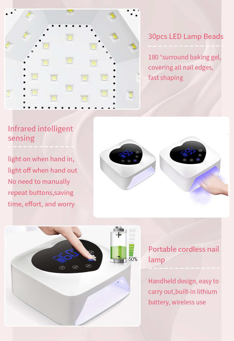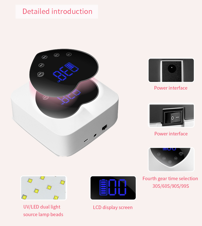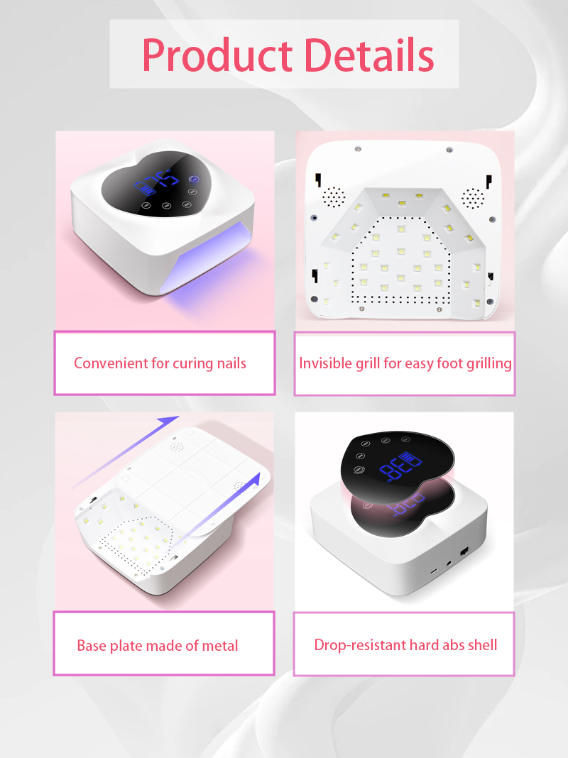 Le produit assure un séchage uniforme de la colle sans retrait. Ses deux sources de lumière fournissent un chauffage doux pour éviter la décoloration des mains et la fatigue oculaire, adaptées aux mains et aux pieds, offrant des résultats de séchage remarquablement rapides.