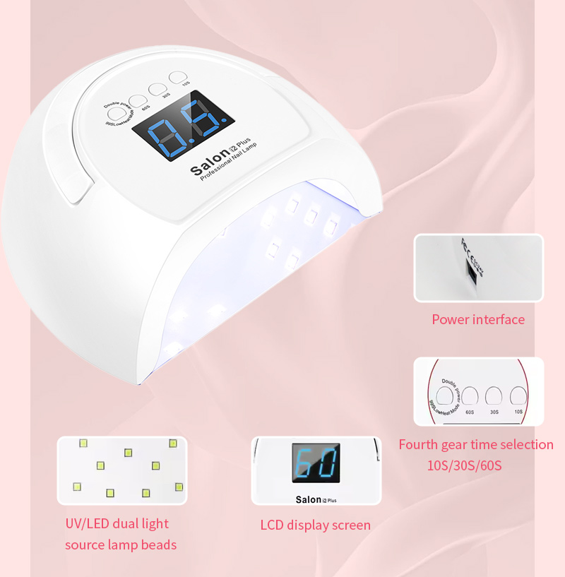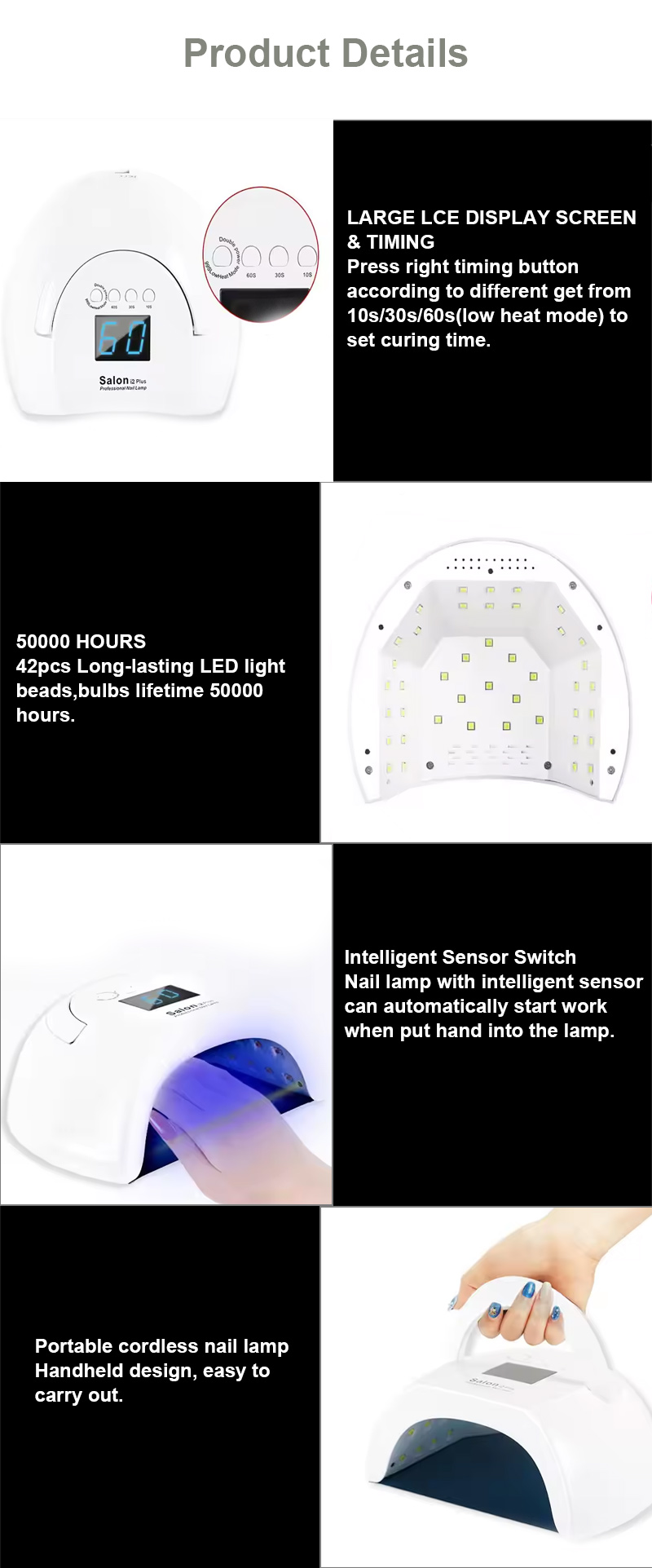 Le produit assure un séchage uniforme de la colle sans retrait. Ses deux sources de lumière fournissent un chauffage doux pour éviter la décoloration des mains et la fatigue oculaire, adaptées aux mains et aux pieds, offrant des résultats de séchage remarquablement rapides.