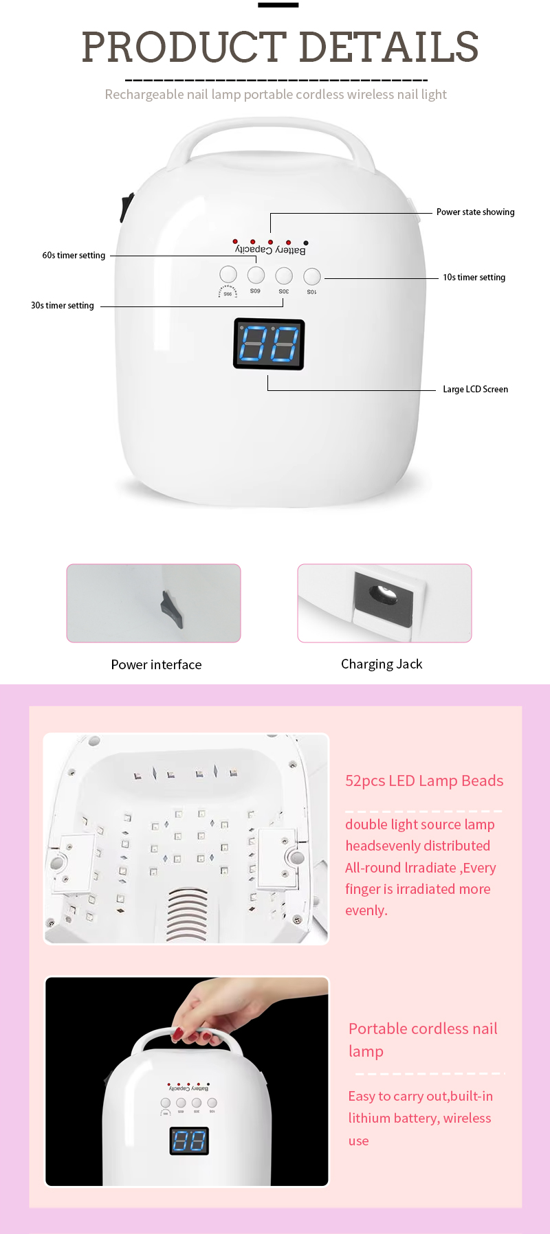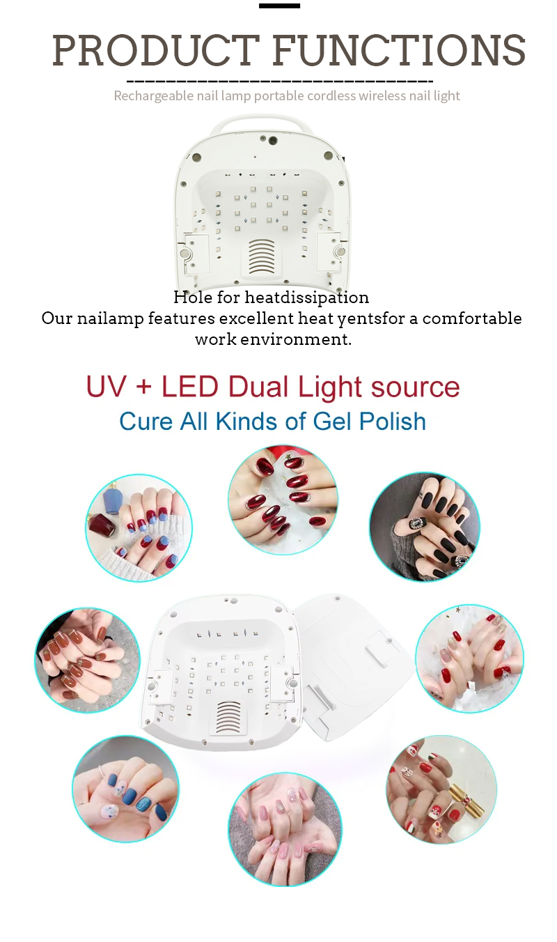 Le produit assure un séchage uniforme de la colle sans retrait. Ses deux sources de lumière fournissent un chauffage doux pour éviter la décoloration des mains et la fatigue oculaire, adaptées aux mains et aux pieds, offrant des résultats de séchage remarquablement rapides.