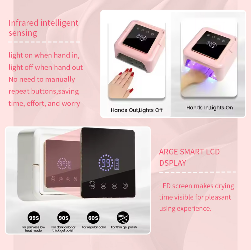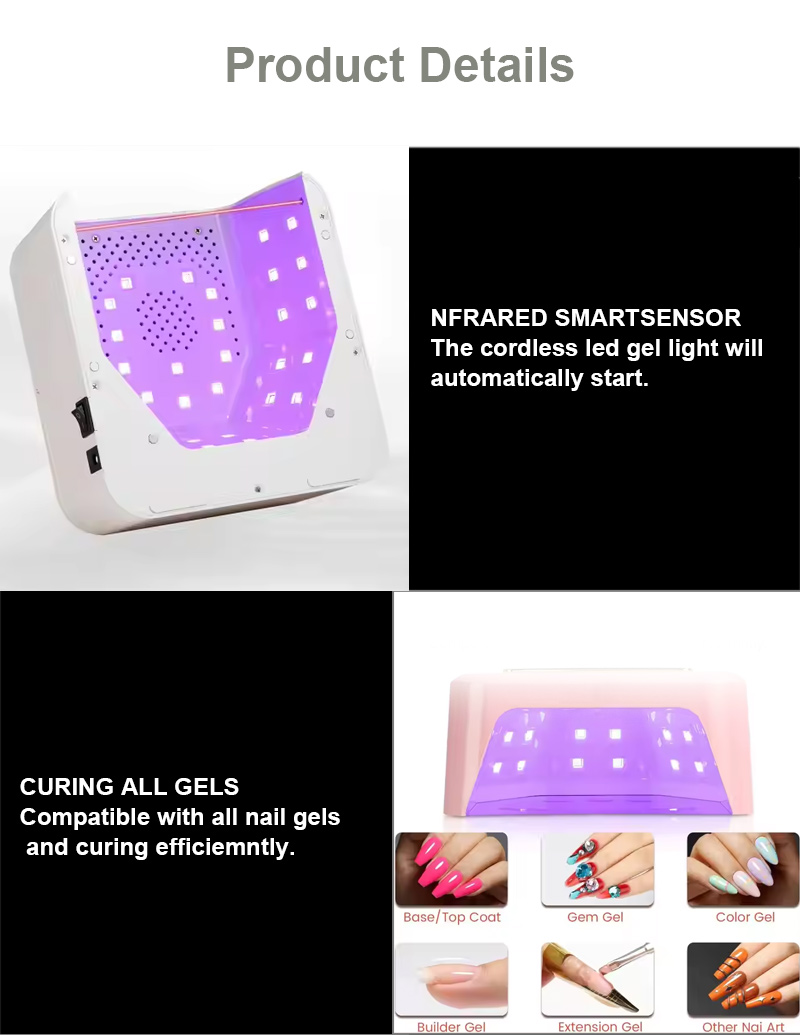 Cette lampe à séchage rapide pour vernis à ongles gel de haute qualité assure un séchage uniforme de la colle sans rétrécissement. Ses deux sources de lumière fournissent un chauffage doux pour éviter la décoloration des mains et la fatigue oculaire, adaptées aux mains et aux pieds, offrant des résultats de séchage remarquablement rapides.