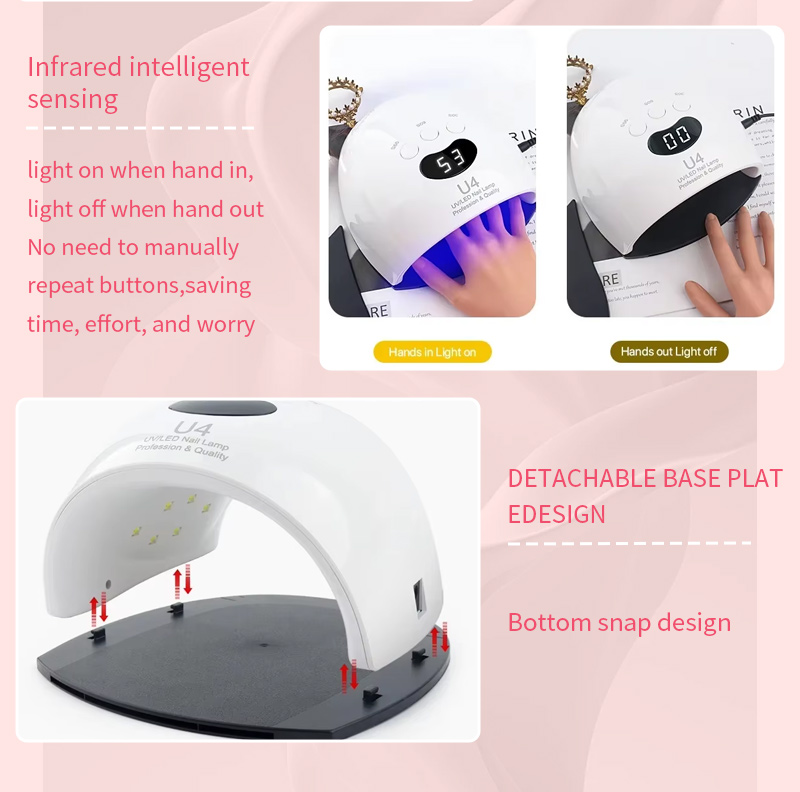 Cette lampe de séchage d'ongles LED de haute qualité assure un séchage uniforme de la colle sans rétrécissement. Ses deux sources de lumière fournissent un chauffage doux pour éviter la décoloration des mains et la fatigue oculaire, adaptées aux mains et aux pieds, offrant des résultats de séchage remarquablement rapides.