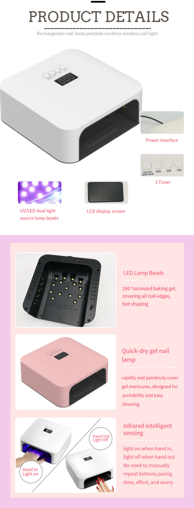 La lampe de séchage rapide des ongles de haute qualité assure un séchage uniforme de la colle sans rétrécissement. Ses deux sources de lumière fournissent un chauffage doux pour éviter la décoloration des mains et la fatigue oculaire, adaptées aux mains et aux pieds, offrant des résultats de séchage remarquablement rapides.