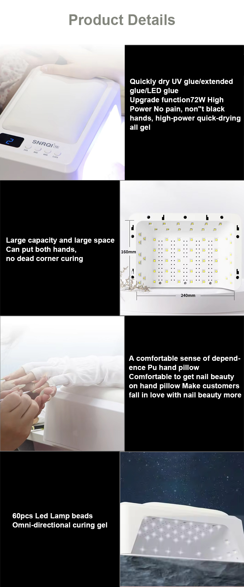 Le produit assure un séchage uniforme de la colle sans retrait. Ses deux sources de lumière fournissent un chauffage doux pour éviter la décoloration des mains et la fatigue oculaire, adaptées aux mains et aux pieds, offrant des résultats de séchage remarquablement rapides.
