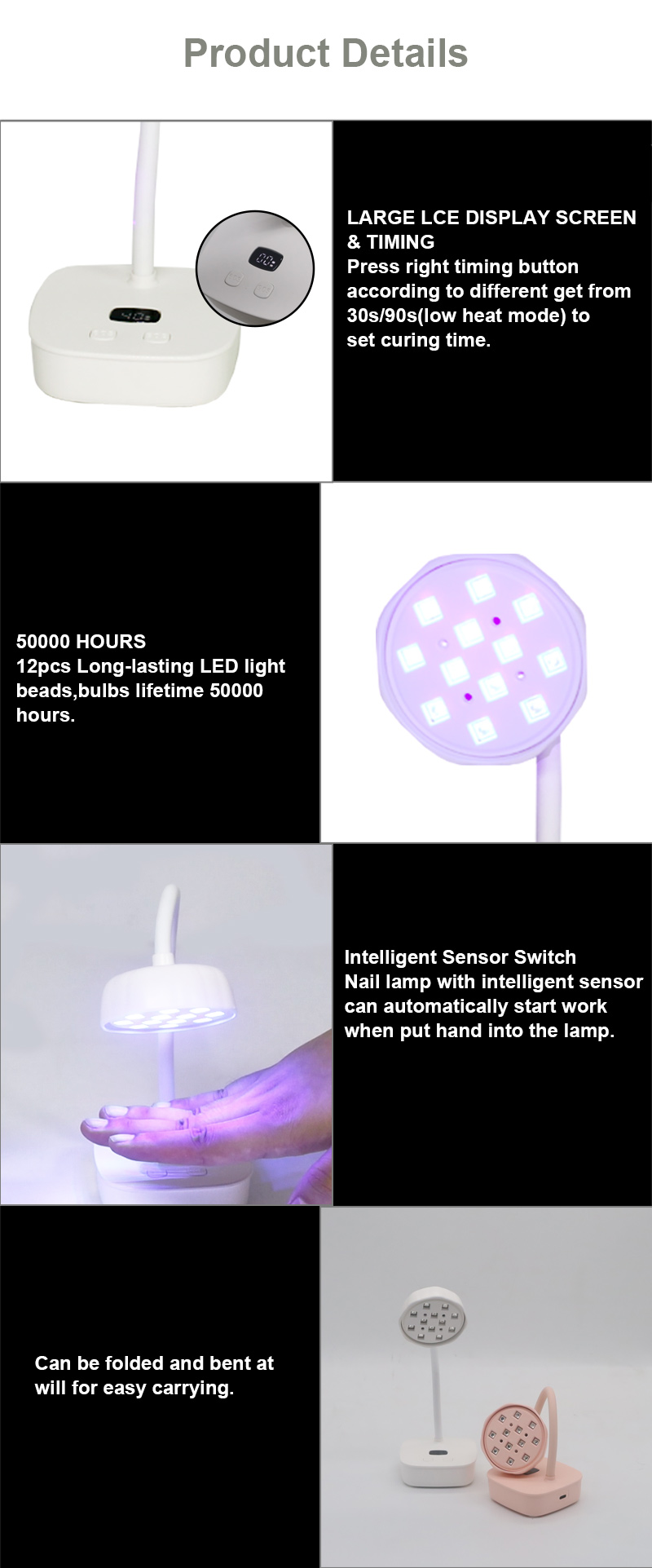 Le produit assure un séchage uniforme de la colle sans retrait. Ses deux sources de lumière fournissent un chauffage doux pour éviter la décoloration des mains et la fatigue oculaire, adaptées aux mains et aux pieds, offrant des résultats de séchage remarquablement rapides.