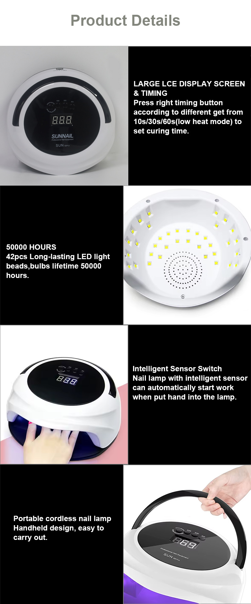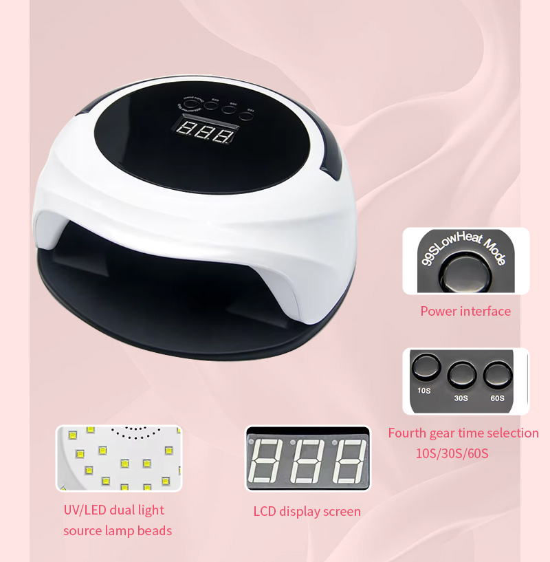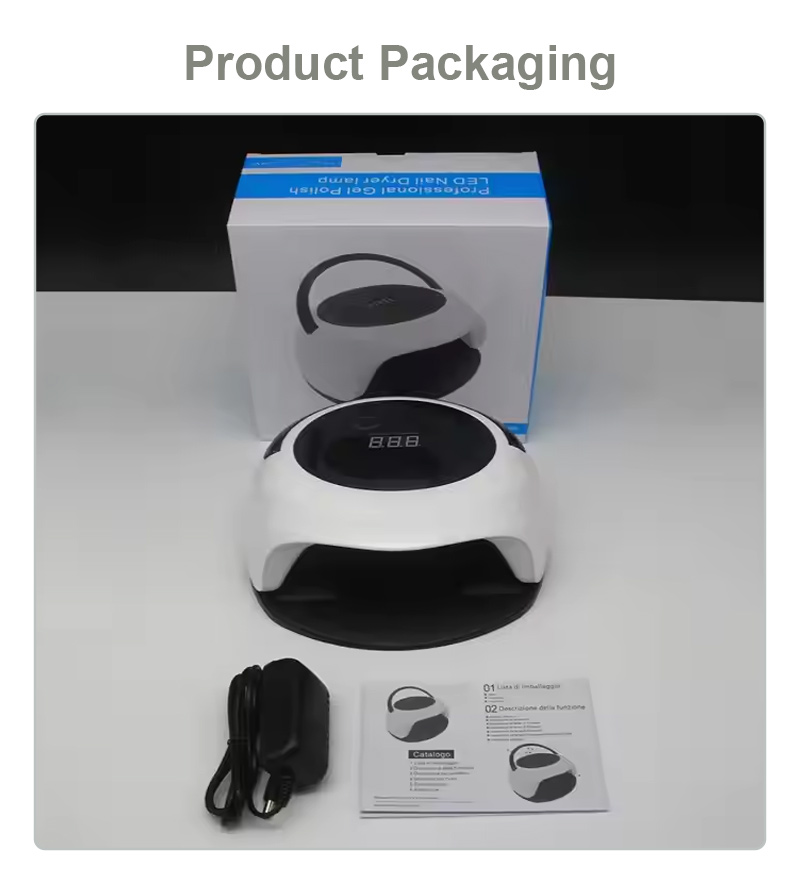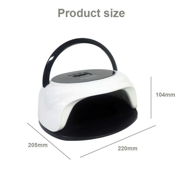 Les dimensions de la lampe de séchage des ongles avec fonction de capteur automatique sont de 205 mm de longueur, 220 mm de largeur et 104 mm de hauteur, avec une grande capacité et la possibilité d'utiliser les mains et les pieds, ce qui est très pratique.
