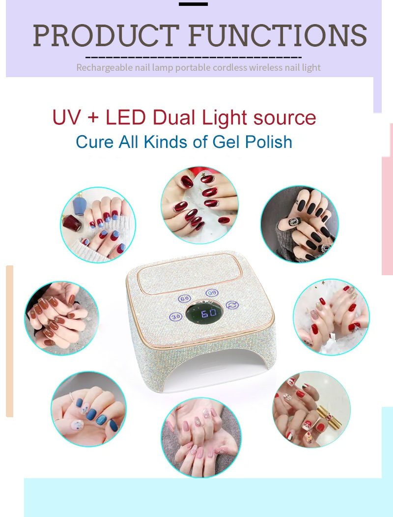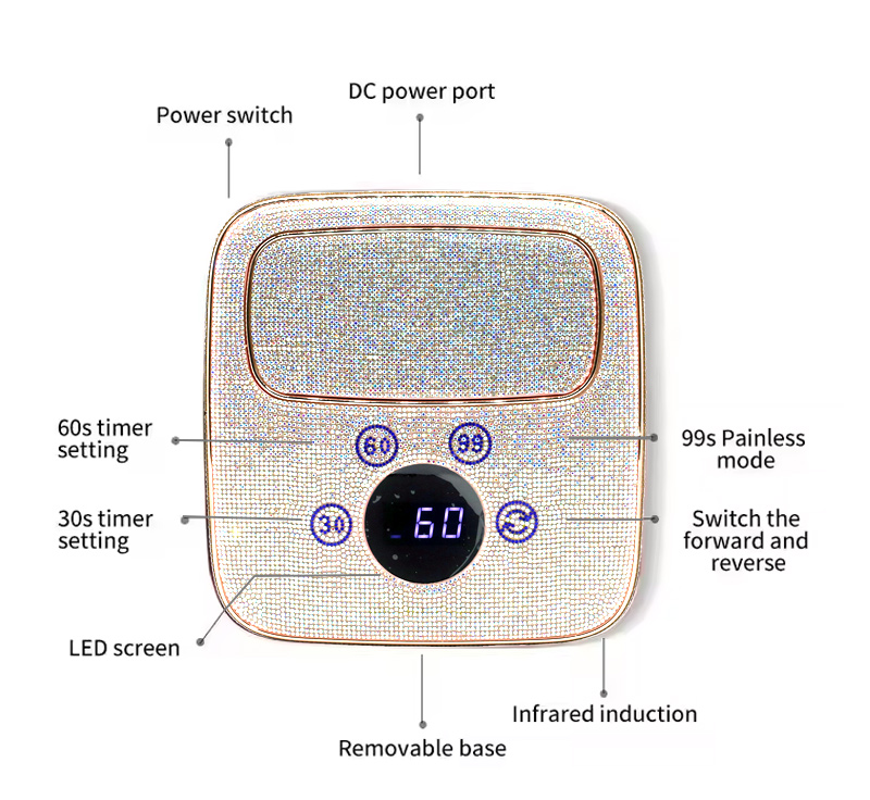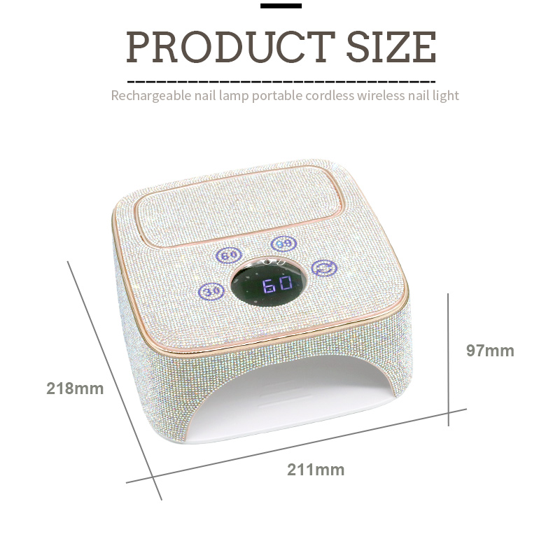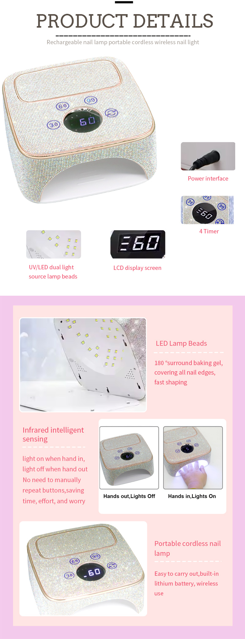Apparence de produit professionnel de vernis à ongles rechargeable Version 90W Le produit a une conception de rainure, la poignée dans la rainure peut être utilisée comme un rôle de poignée portable, ce qui le rend plus pratique à transporter et à mettre. Il évite également l'inconvénient que la poignée soit facilement brisée et détachée.