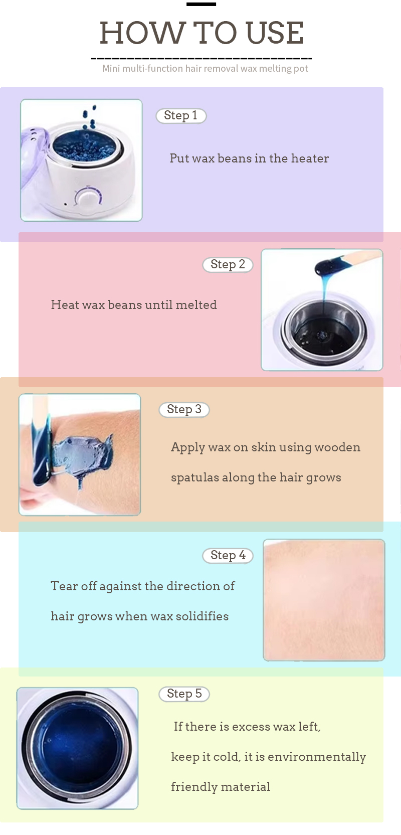 Méthode de fonctionnement de la cire à épiler du produit, plus la température est élevée, plus la cire fond rapidement, plus la température est basse, plus la cire fond lentement, versez d'abord dans la quantité appropriée de grains de cire à épiler, en chauffant jusqu'à ce que les grains de cire fondent, puis les parties épilatoires de la cire à épiler uniformément enduite, et enfin dans le sens de la croissance des cheveux, arrachez-les.