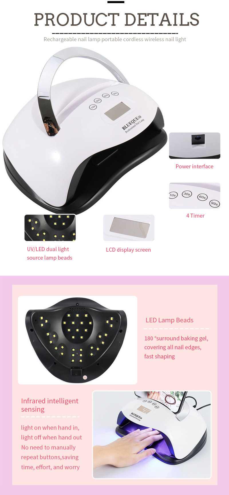 Les produits ont une détection intelligente infrarouge, la lumière portée à la main, la main éloignée de la lumière, pas besoin de répéter manuellement la clé, économisez du temps et des efforts, une colle de cuisson haute puissance sans attendre longtemps, gagnez du temps avec une main.