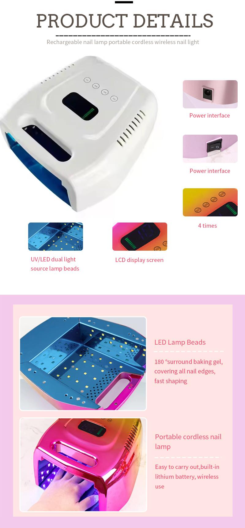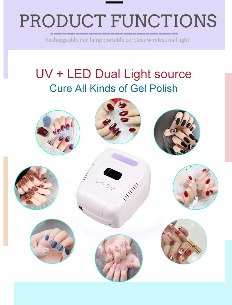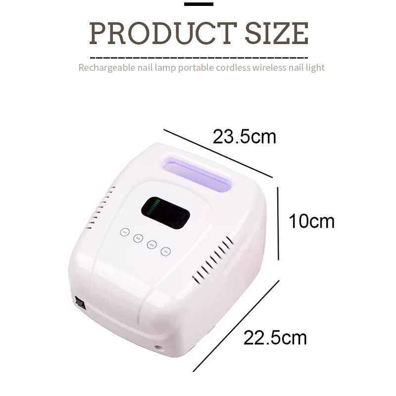 Lampe de vernis à ongles rechargeable version 160W Apparence du produit a une conception de rainure, la poignée dans la rainure peut être utilisée comme un rôle de poignée portable, ce qui le rend plus pratique à transporter et à mettre. Il évite également l'inconvénient que la poignée soit facilement brisée et détachée.