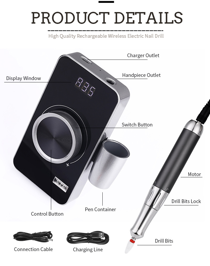 Caractéristique du produit et application de la 107 fichier de ongles électrique à débit de vernis à ongles à haute vitesse 35000 tr / min