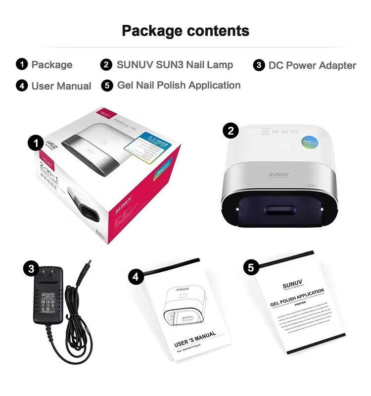 1)Salon de manchons à clous rechargeable Salon UV Sécheur 48W Le paquet de produits est livré avec un manuel, une prise de chargeur, un câble de charge, une lampe à ongles.