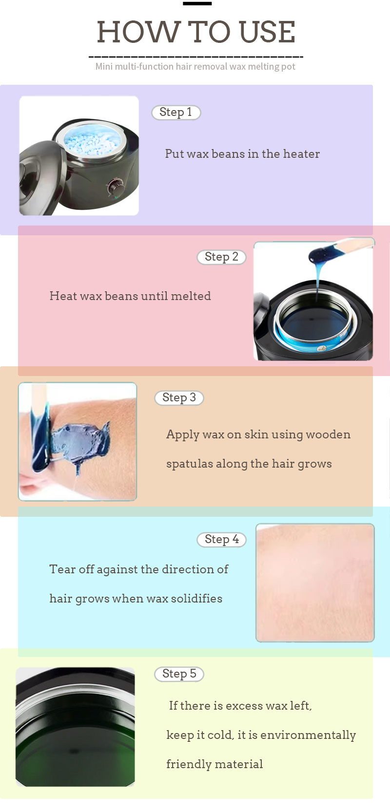 Méthode de fonctionnement de la cire à épiler du produit, plus la température est élevée, plus la cire fond rapidement, plus la température est basse, plus la cire fond lentement, versez d'abord dans la quantité appropriée de grains de cire à épiler, en chauffant jusqu'à ce que les grains de cire fondent, puis les parties épilatoires de la cire à épiler uniformément enduite, et enfin dans le sens de la croissance des cheveux, arrachez-les.